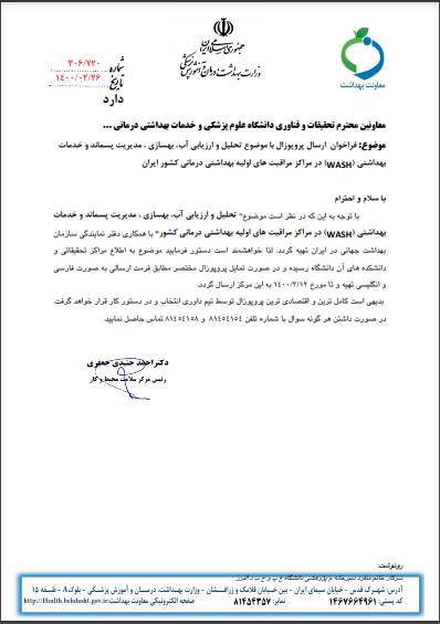 فراخوان ارسال پروپوزال با موضوع "تحلیل و ارزیابی آب، بهسازی، مدیریت پسماند و خدمات بهداشتی در مراکز بهداشتی درمانی در مراکز مراقبت های اولیه بهداشتی درمانی کشور ایران"