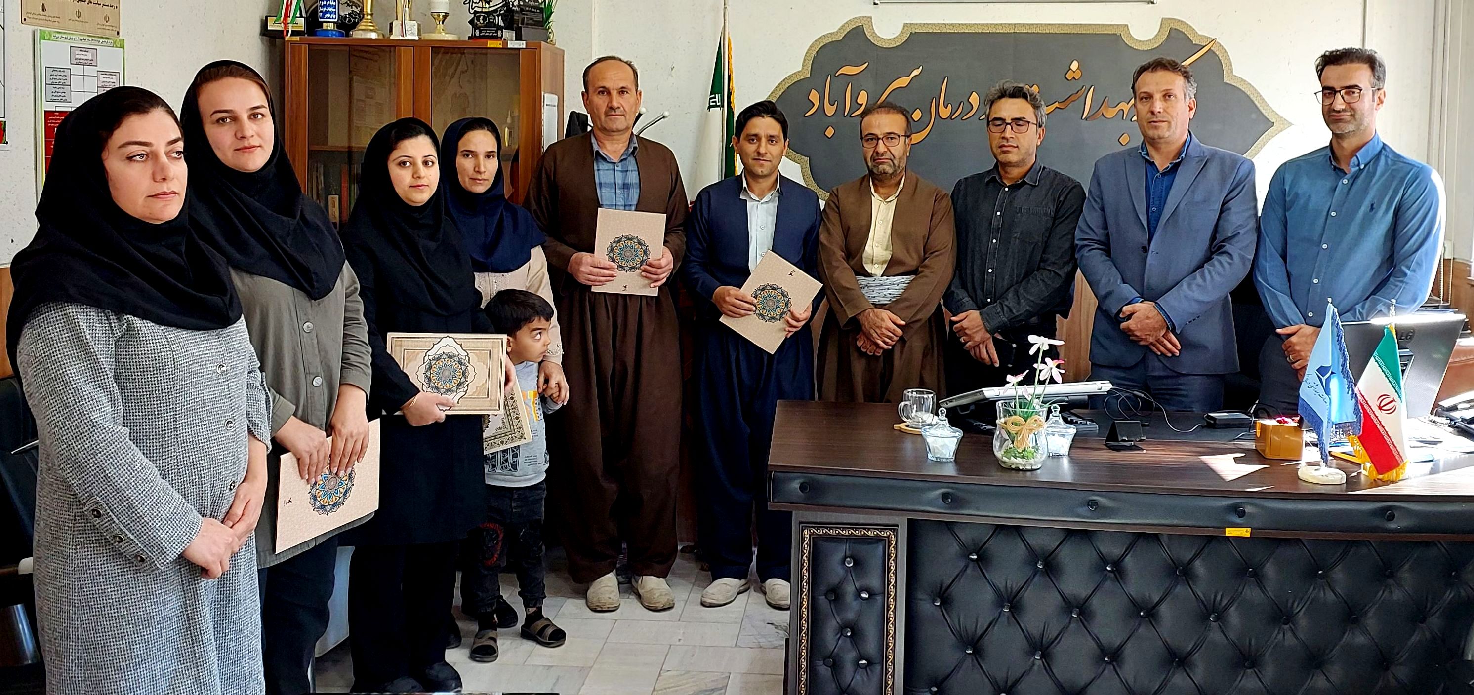 بهورزان نمونه استانی محمدامین رضایی، زهرا محمدی و شیوا خدامرادی، بهورز نمونه کشوری نظیره روحی و مراقبین سلامت نمونه سمیرا ادوایی و پریناز اداک معرفی و تجلیل شدند. همچنین از کاظم صحرایی، کارشناس آموزش بهورزی مرکز بهداشت شهرستان، به پاس تلاشهای ارزشمند در آموزش و توانمندسازی بهورزان قدردانی شد.