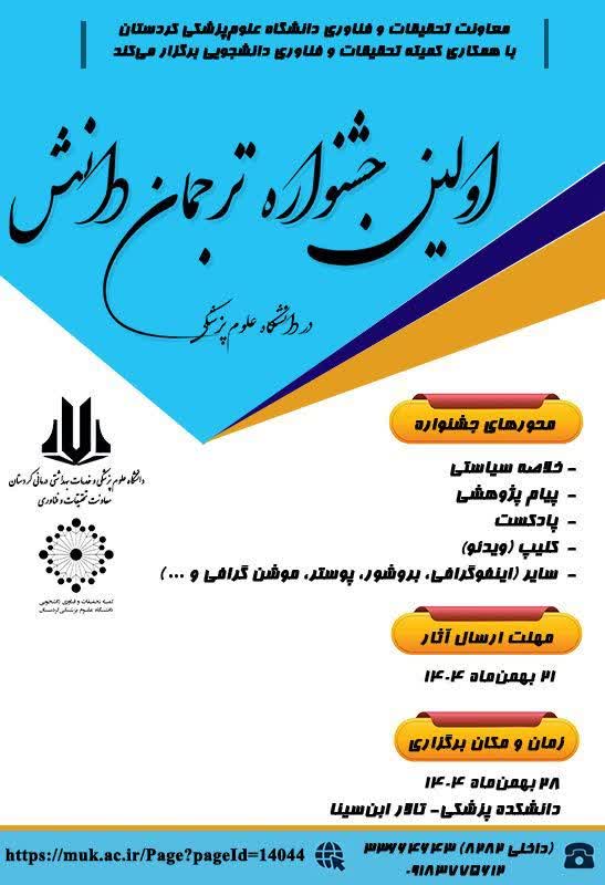 معاونت تحقیقات و فناوری دانشگاه با همکاری کمیته تحقیقات و فناوری دانشجویی، نخستین جشنواره داخلی «ترجمان دانش» را با هدف ارائه و ترویج دستاوردهای پژوهشی برگزار میکند. اعضای هیأت علمی، دانشجویان و پژوهشگران میتوانند نتایج طرحهای تحقیقاتی و پایاننامههای خاتمهیافته سال ۱۴۰۴ را به دبیرخانه جشنواره ارسال کنند.